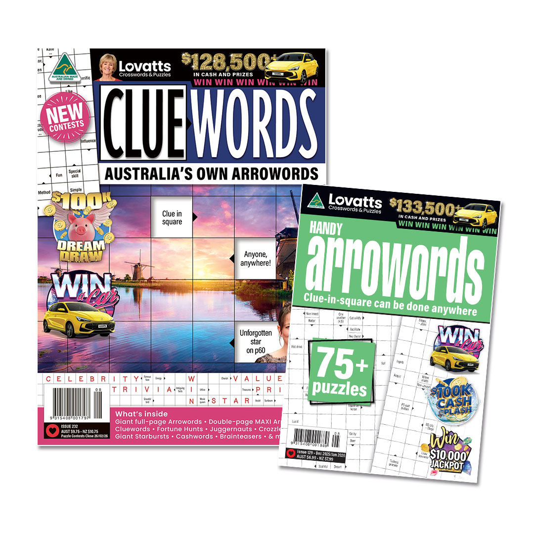 Arroword puzzles have the clues in the black squares for convenience and fun. The Cluewords magazine features large arroword puzzles plus the giant Maxi crossword. Handy Arrowords features a generous serve of snack-sized crosswords in an on-the-go-sized magazine. Most arrowords contain clues to everyday words but we’ve also included a selection of trivia, themed and celebrity crosswords for your enjoyment.