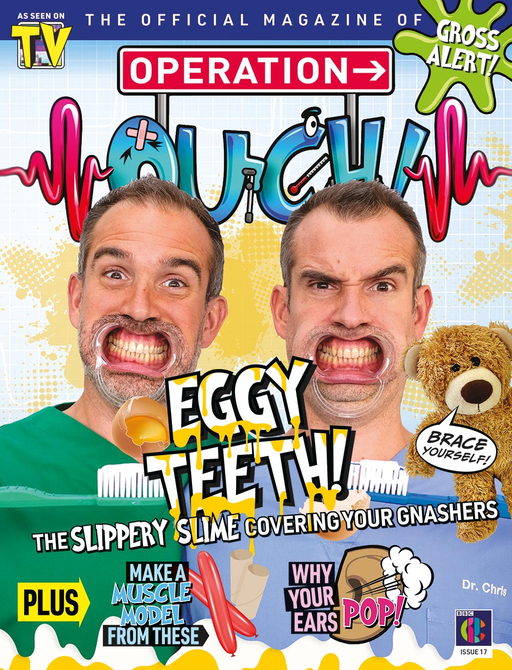 Brace yourselves! In this issue of Operation Ouch! magazine, you'll learn all about the weird and wonderful world of teeth! Did you know that your teeth are covered in a substance that's harder than steel? Open wide and take a look. There's also cool things to learn about your extraordinary ears and your mighty muscles, including what you can do to make them nice and strong. Match the animals to their tooth prints in the What's For Dinner? game and bamboozle your brain with puzzles like Organ Match and Squirrel Scramble. Watch out for the GROSS alerts!