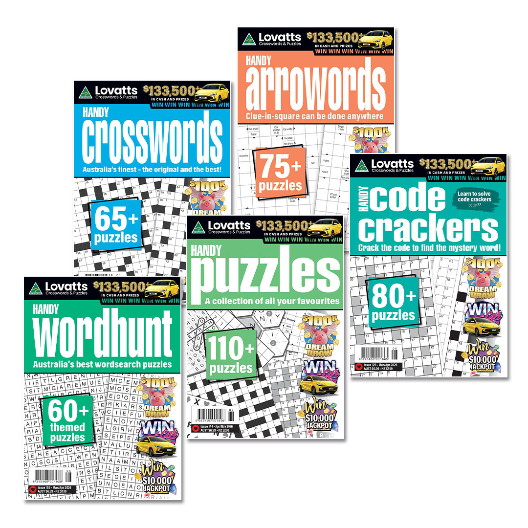 The Handy Value Pack contains 5 x pocket-sized bi-monthly puzzle books: Handy Wordhunt, Crosswords, Puzzles, Arrowords and Code Crackers. Receive 30 magazines per year.
