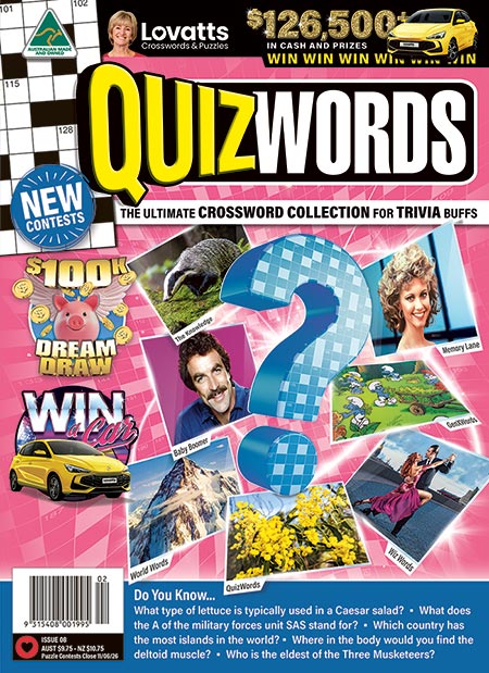 QuizWords magazine is a trivia lover's dream! It's packed with engaging crosswords featuring fun trivia-style clues. Relive nostalgic moments with the delightful Baby Boomer, Gen XWords, and Memory Lane crosswords. Sharpen your wits and expand your horizons with clever crosswords The Knowledge, Wiz Words, Know-How, and World Words; and be entertained by Giant Starbursts, Sports Words, acrostics, and cryptograms! Filled with fascinating factoids and tantalising titbits, QuizWords is perfect for solving solo or sharing with family and friends. Plus, there are 5 exciting contests, with cash and prizes up for grabs!